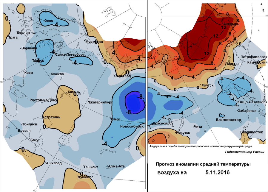 Карты прогноза аномалий температуры, минимальной и максимальной суточной температуры на 2 - 5 ноября 2016.