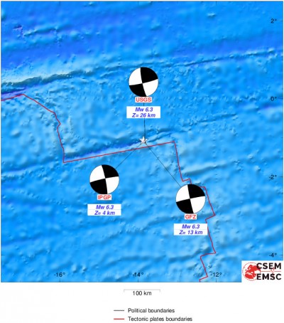 На Южно - Атлантическом хребте, у острова Вознесения, - 23 октября 2019 - произошло землетрясение магнитудой 6.3 на глубине около 4 - 26 км под дном океана.