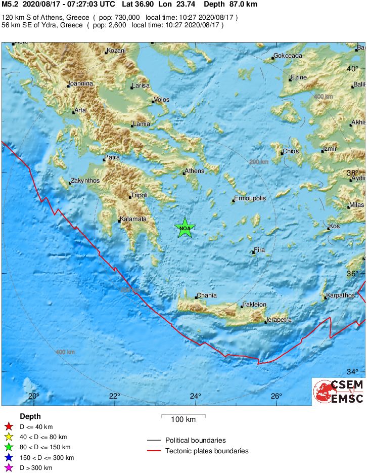 У побережья Греции - 17 августа 2020 - произошло землетрясение магнитудой 5.0 - 5.2 - на глубине около 80 - 87 км.