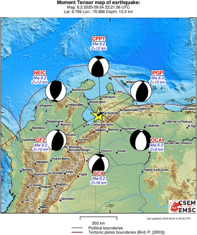 В Венесуэле - 24 сентября 2025 - произошла серия землетрясений магнитудой 6.2 - 6.3 на глубине около 10 - 16 км.