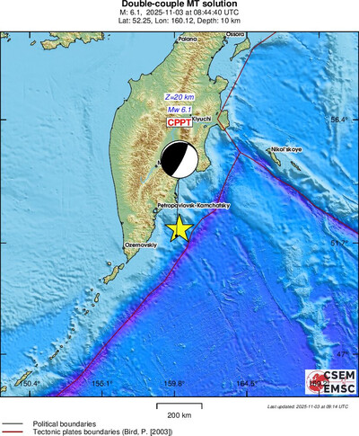 На Камчатке - 3 ноября 2025 - произошло землетрясение магнитудой 6.1- 6.2 на глубине около 10 - 14 км.