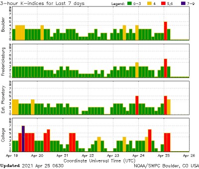 25 апреля 2021 - в результате вспышек на Солнце - возмущения магнитосферы продолжились. Началась магнитная буря средней интенсивности.