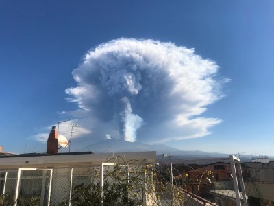 Вместе с потоками раскаленной лавы, которые достигли 300 метров в высоту, вулкан Этна выбросил гигантский столб кратерного пепла, а затем обрушил шквал камней.