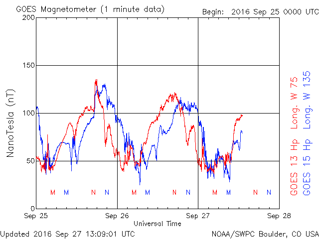 Это продолжение магнитной бури, которая произошла 25 сентября 2016. Уровень возмущений G-1. Данные.