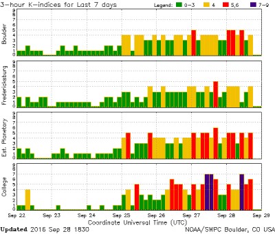 Это продолжение магнитной бури, которая началась 27 сентября 2016. Уровень возмущений G-1. Данные.
