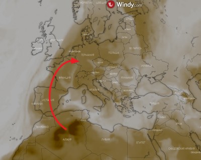 Над Алжиром сформировался пылевой шлейф и направился на север в Средиземноморье, в настоящее время он движется в сторону Западной Европы.