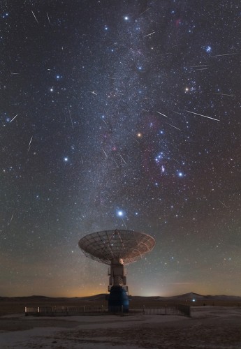 Изображение состоит из 37 отдельных кадров с метеорами, сделанных в течение 8,5 часов - в ночь с 12 на 13 декабря 2017. В финальном композите они одновременно сгорают в звездном небе над радиотелескопом MUSER, установленном на станции Mingantu во Внутренней Монголии, примерно в 400 километрах от Пекина.