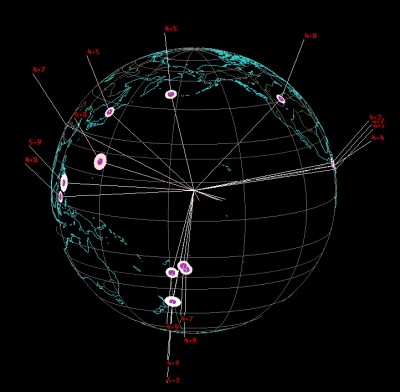 В моменты резонансных землетрясений магнитудой более 6.0 практически в 100 % сейсмособытий- планеты Солнечной системы находятся в угловых точках космограммы- гороскопа события. Либо на Восходе- ASC и в Зените- на MC, в 10 секторе. Либо на Закате- на DSC и в Глубине Неба- на IC. Возможны различные варианты, но чаще срабатывает аспект между планетами квадратура- в 70- 80 % сейсмособытий. Также на сейсмический резонанс может срабатывать сходящаяся или распадающаяся оппозиция двух и более планет замкнутая в конфигурацию тау- квадрат. Тогда "звучат три угловые точки гороскопа сейсмособытия.
