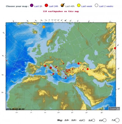 На 4 сентября 2016 сейсмические резонансы под действием космологических факторов наблюдаются во всём Тихоокеанском огненном кольце, на Альпийско - Гималайском сейсмическом поясе.