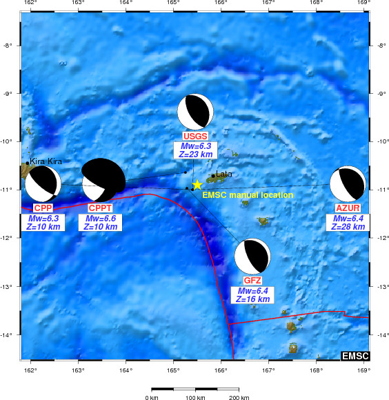 | Magnitude | Mw 6.7 | | Region | SANTA CRUZ ISLANDS | | Date time | 2013-02-01 22:16:38.0 UTC | | Location | 10.88 S ; 165.46 E | | Depth | 36 km | | Distances | 2256 km NE Brisbane (pop 1,843,392 ; local time 08:16:38.7 2013-02-02) 1611 km NW Suva (pop 199,455 ; local time 10:16:38.7 2013-02-02) 546 km NW Luganville (pop 13,397 ; local time 09:16:38.7 2013-02-02) 45 km SW Lata (pop 538 ; local time 09:16:38.7 2013-02-02) |