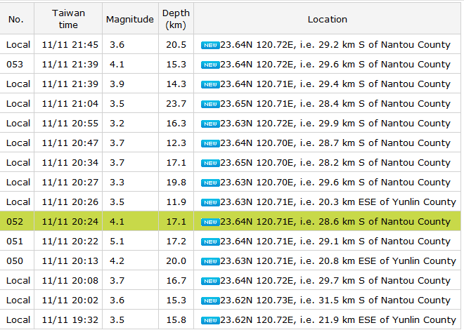 На Тайване - 11 ноября 2017 - наблюдается сейсмическая аномалия - за 2 часа произошло более 14 землетрясений магнитудой 3.2 - 5.1.