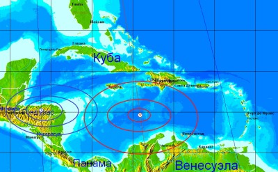 На развороте Плутона - тау - квадрат Меркурий, Солнце, Уран - Юпитер - Плутон - действует на весь регион Центральной Америки и страны, острова Карибского моря.