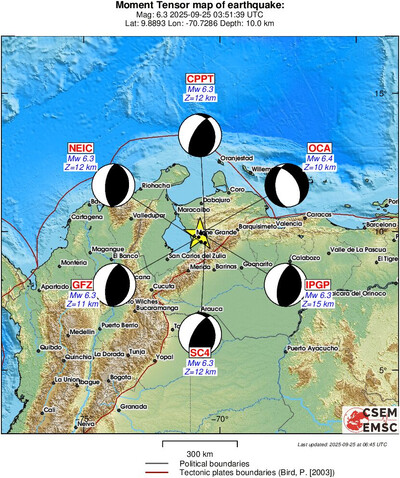 В Венесуэле - 24 сентября 2025 - произошла серия землетрясений магнитудой 6.2 - 6.3 на глубине около 10 - 16 км.