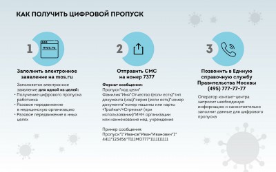 2. Еще один способ оформления цифрового пропуска — с помощью СМС на номер 7377. В сообщении должны быть указаны код цели передвижения по городу (1 — для поездок на работу, 2 — для поездок в медицинское учреждение, 3 — иные цели), фамилия, имя и отчество того, кому необходим пропуск, серия и номер паспорта, номер машины или карты «Тройка"/"Стрелка» (при использовании), а также ИНН организации или наименование медицинского учреждения, в которое вы направляетесь. Пример сообщения: Пропуск*1*Иванов*Иван*Иванович*1* 4411*123456*Т111МО777*1111111111.