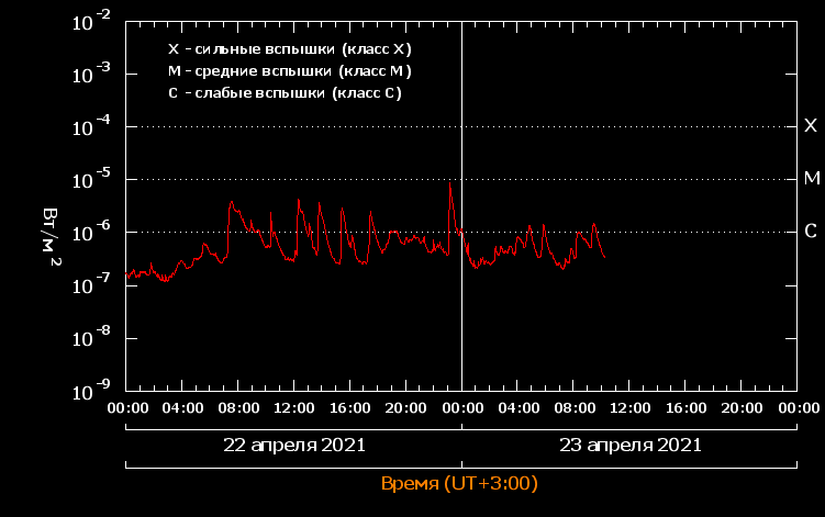 На Солнце - 22 апреля 2021 - произошло 11 вспышек класса C, 23 апреля 2021 - активность Солнца продолжается.