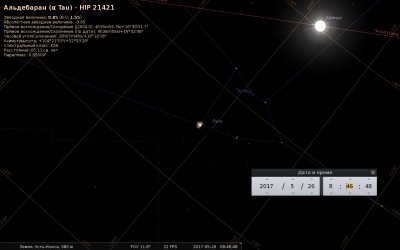 Двенадцатое затмение Альдебарана Луной 8 мая 2016 года будет проходить при темной Луне в приближении прохождения Землей экватора Солнца и орбиты Меркурия.