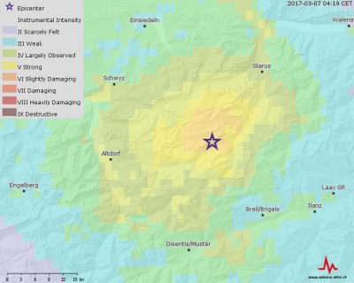 Отмечается, что землетрясение магнитудой 4,6 по шкале Рихтера ударило по центральной Швейцарии в ночь на 7 марта, примерно в в 6 км к западу от города Линталь.