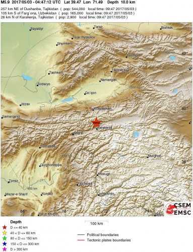 В Средней Азии, на территории Таджикистана и Узбекистана - 3 мая 2017 - произошло землетрясение магнитудой 5.9 на глубине около 10 км.