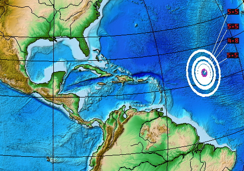 | Magnitude | Mw 5.5 | | Region | NORTHERN MID-ATLANTIC RIDGE | | Date time | 2012-10-04 23:14:56.0 UTC | | Location | 17.45 N ; 46.49 W | | Depth | 10 km | | Distances | 2112 km N Belém (pop 1,407,737 ; local time 20:14:56.8 2012-10-04) 1600 km NE Paramaribo (pop 223,757 ; local time 20:14:56.8 2012-10-04) 1487 km E Bridgetown (pop 98,511 ; local time 19:14:56.8 2012-10-04) |